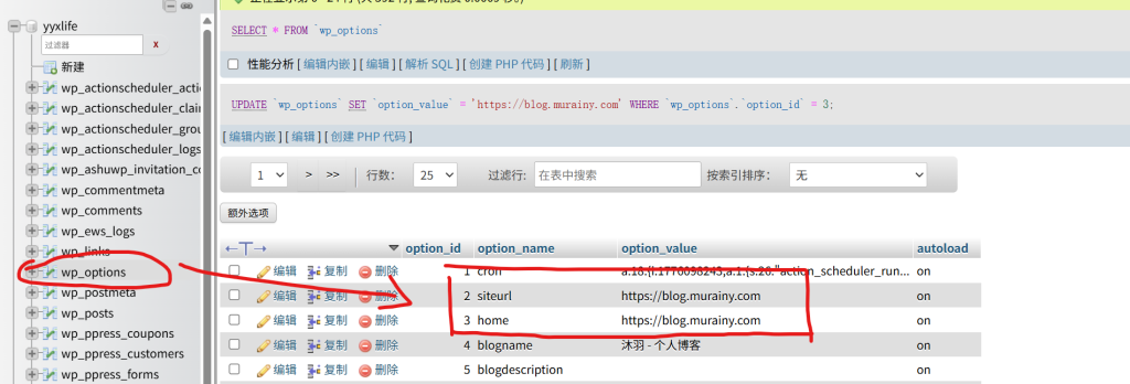 这个很简单,mysql数据库的话,用phpmyadmin或其他数据库管理工具登录,在数据表中找到wp_options表,修改siteurl和home的值就可以啦